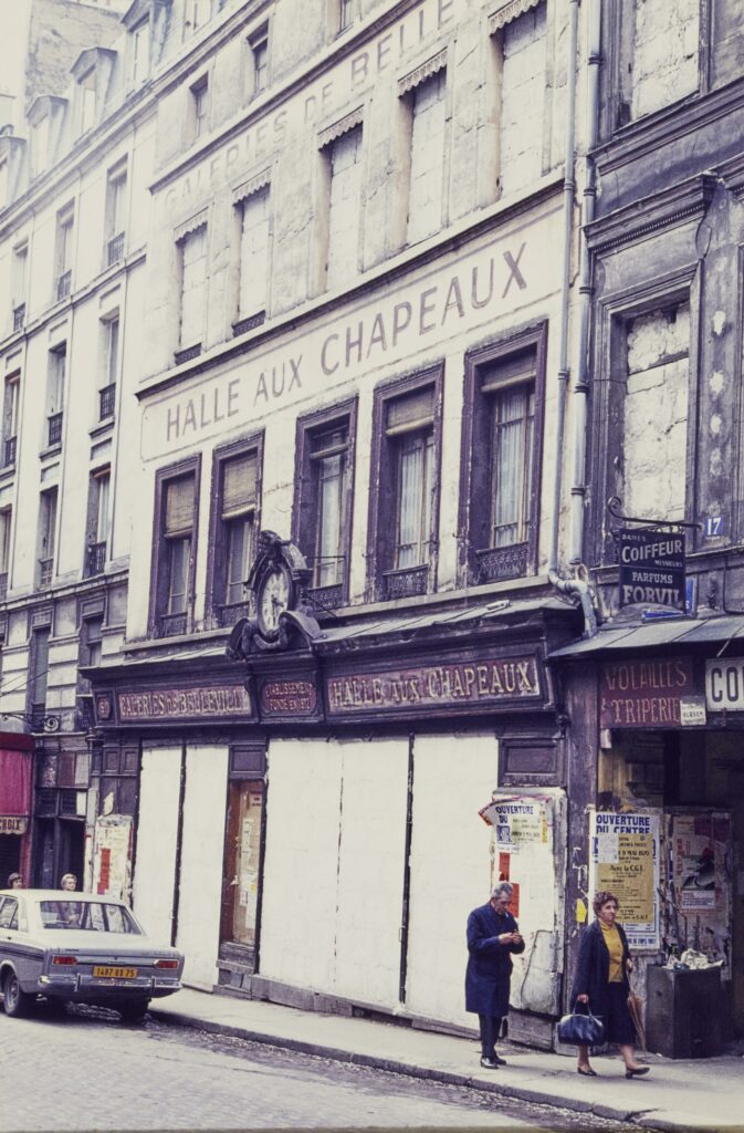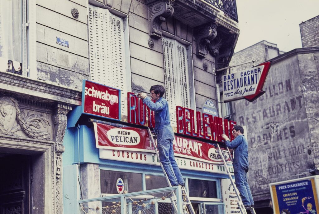 Une scène de vie qui nous rappelle que ces lieux ont vécu avant qu’on ne les fréquente à notre tour. Dans cette série de photos réalisées à Belleville en 1970, vous reconnaîtrez l’arrêt de métro sur le boulevard, l’historique brasserie La Vielleuse (déjà reconnaissable à son large store rouge), la façade des “Galeries de Belleville, halle aux chapeaux » (au numéro 15). Plus haut dans la rue de Belleville, au numéro 201 se tenaient une entreprise de peinture et une herboristerie-parfumerie.
