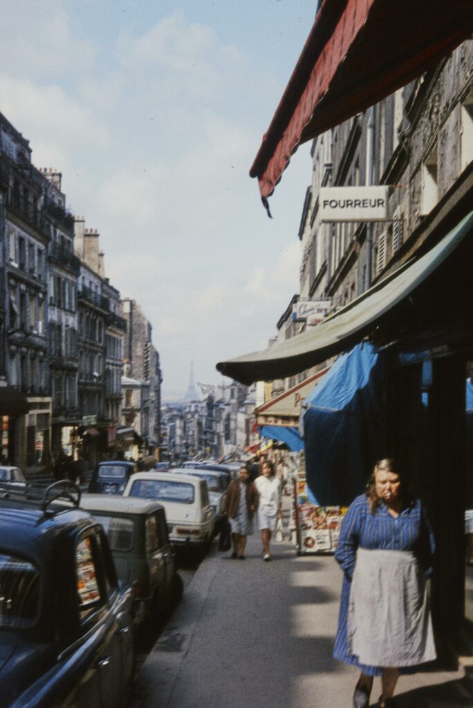 La photo manque de netteté, mais on arrive tout de même à deviner la Tour Eiffel. Pile dans l’axe de la rue de Belleville, dont on reconnaît la pente, 56 ans plus tard. Au premier plan, notre regard est attiré par cette dame d’un certain âge avec son tablier et sa clope au bec. On l’imagine commerçante, dans cette rue animée. Et qu’elle serait sortie prendre un rayon de soleil en fumant sa cigarette devant sa boutique.
