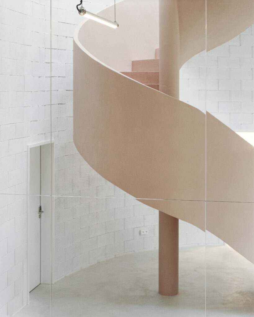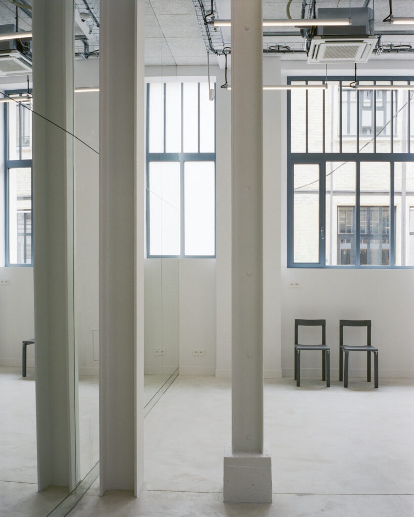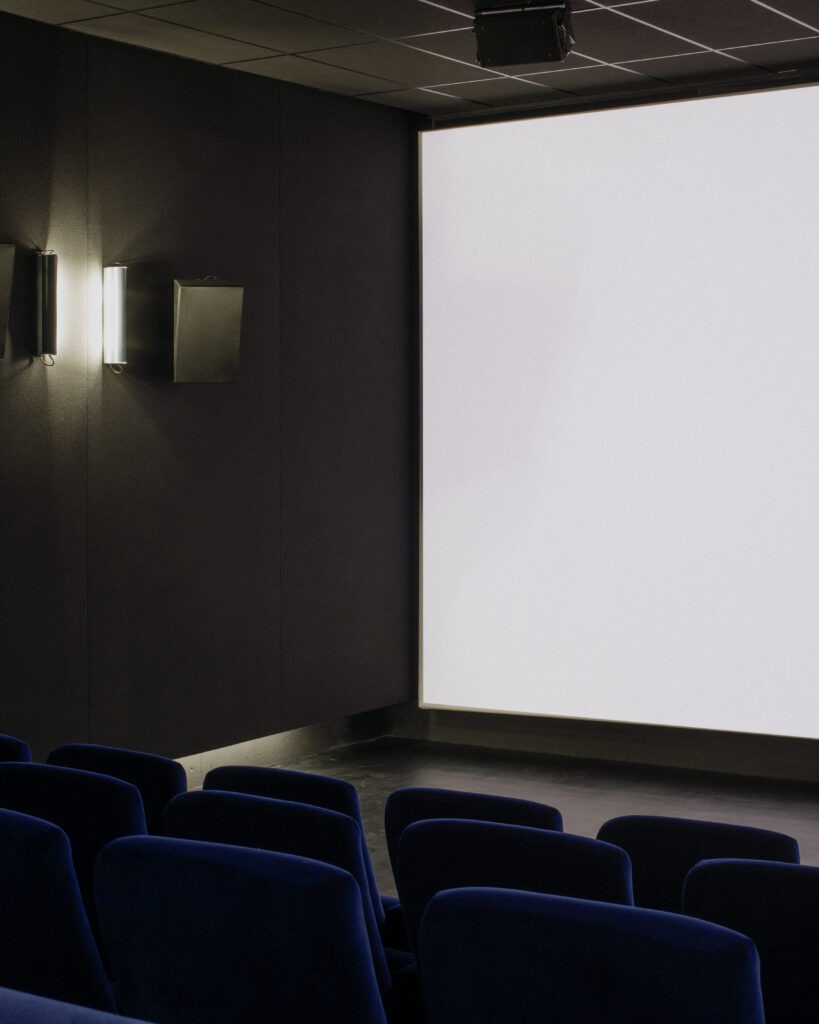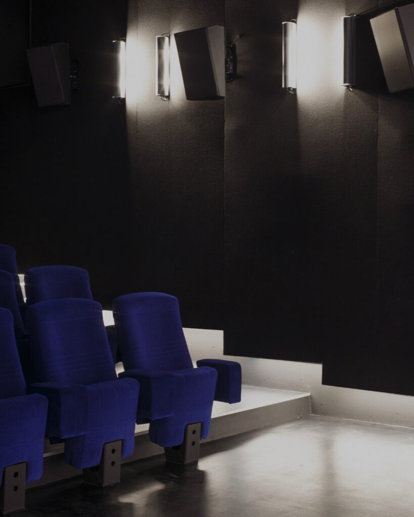 Au rez-de-chaussée, la grande salle de projection disparait derrière un miroir, paradoxe spatial qui duplique l’espace et fait ainsi perdurer le volume initial, tout en le divisant. Le bâtiment rénové s’ancre ainsi dans la tradition du bâtiment industriel : des activités qui évoluent au sein d’une figure qui demeure. Le projet architectural est imaginé comme l’organisation dans l’espace et dans le temps, de ces éléments stables et changeants. »