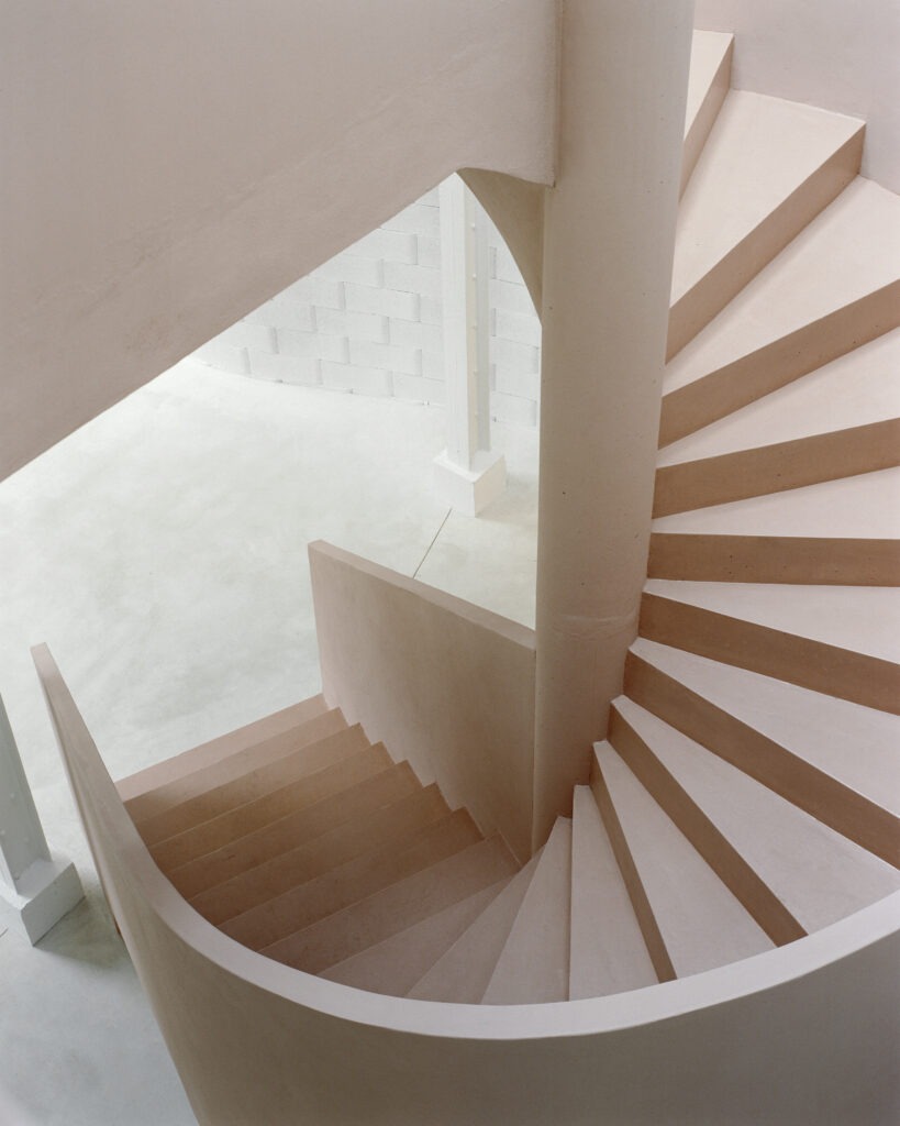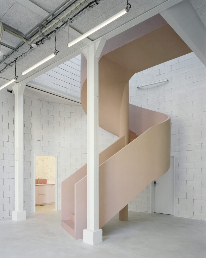 – le projet de gros-oeuvre vise à redonner au lieu les qualités de base pour son bon fonctionnement. L’enveloppe et la structure d’origine sont conservées, ce qui implique un confortement et un renforcement de la structure. Un grand escalier en béton est créé, à la mesure de la vocation du bâtiment. Enfin un mur courbe en blocs d’agglomérés permet de dissimuler les locaux nécessaires quelle que soit l’activité accueillie : sanitaires, local technique, bureau.