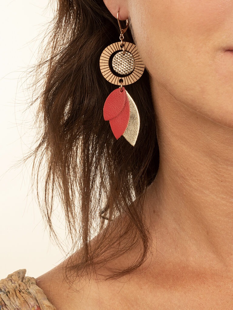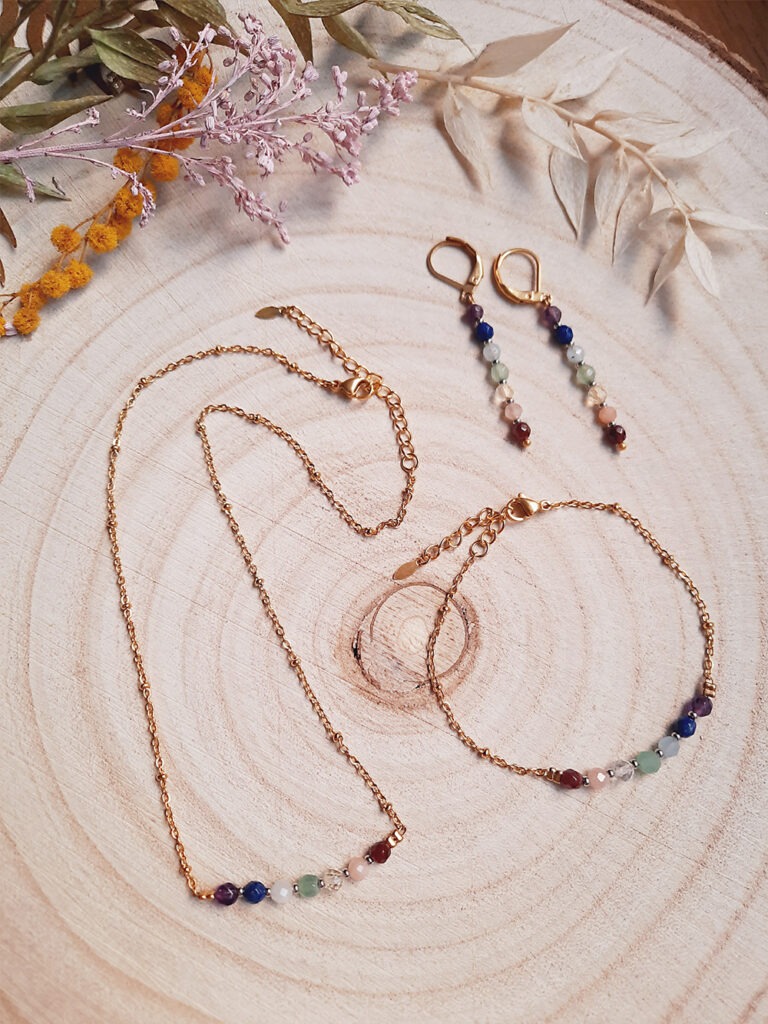 Parmi leurs créations favorites ? Les boucles d’oreilles « Mini Céleste » en cuir upcyclé et laiton doré à l’or rose (vendues 28 €). Le bracelet énergétique “Les 7 chakras” (32 €) et ses 7 pierres naturelles semi-précieuses, montées sur des apprêts en acier inoxydable doré. Un porte-bonheur… made in Atelier Bonheur.