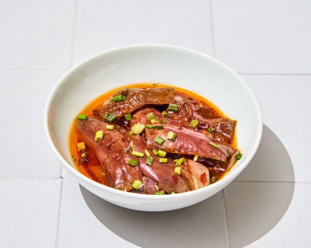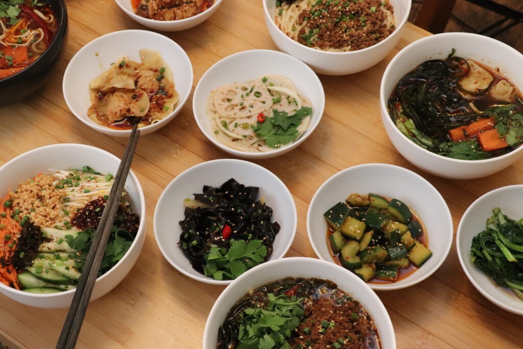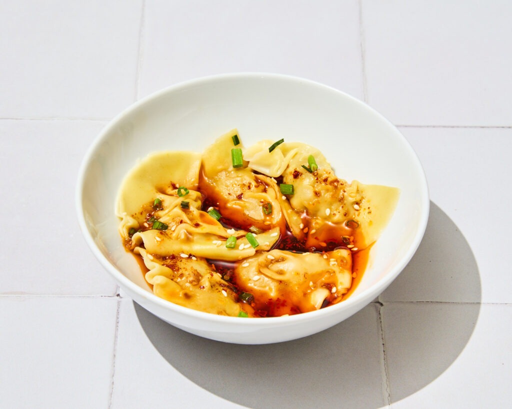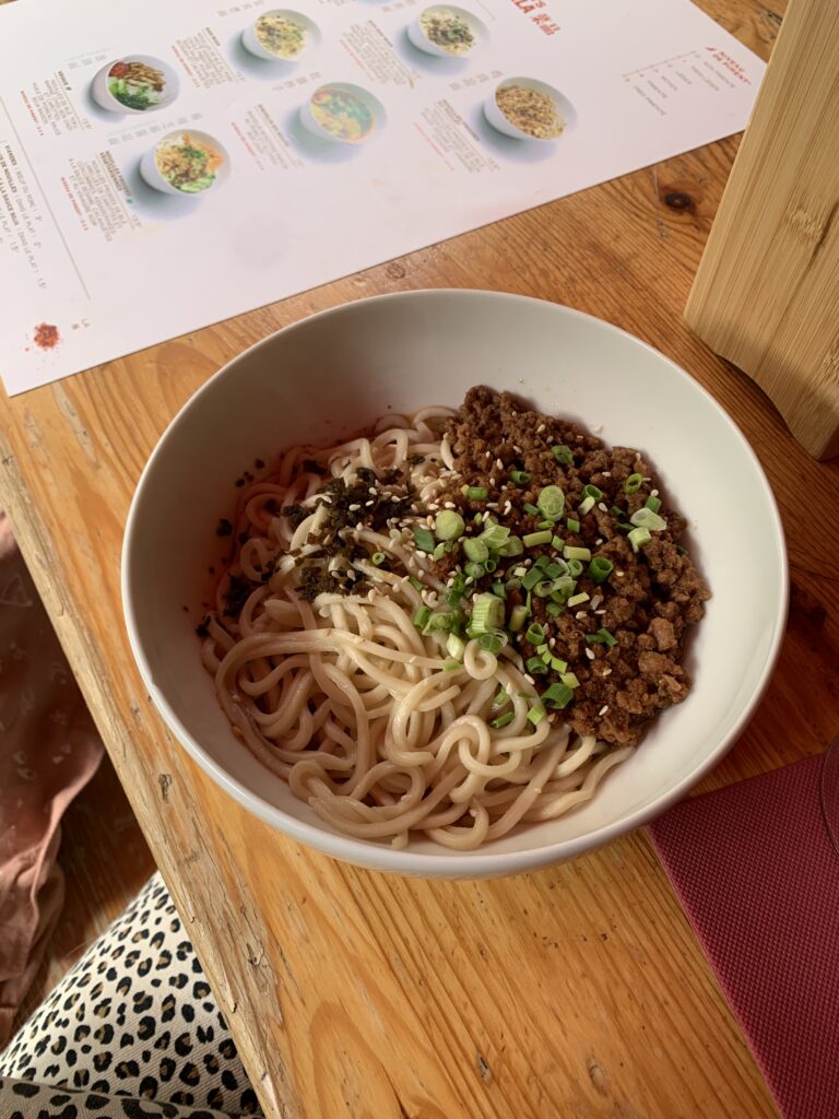 Les best-sellers de la maison ? Les raviolis farcis au porc et au gingembre et les nouilles au porc haché, huile pimentée, sauce soja sucrée, pâte de sésame et beurre de cacahouète. (On a goûté, on valide !). On compte aussi de nombreuses options végétariennes et sans gluten (soit la moitié de la carte), à l’image des aubergines sichuanaises ou des nouilles aux légumes. En dessert, on vous recommande plus typique de la carte : le “tang yuan”, une boule de riz gluant au sésame noir et sauce coco.