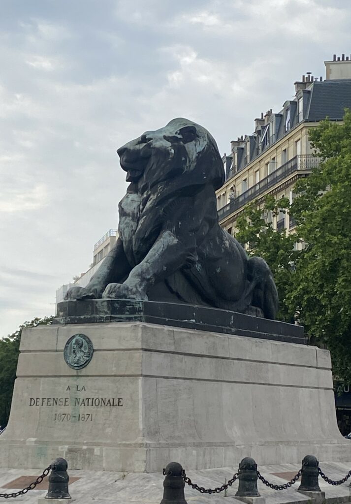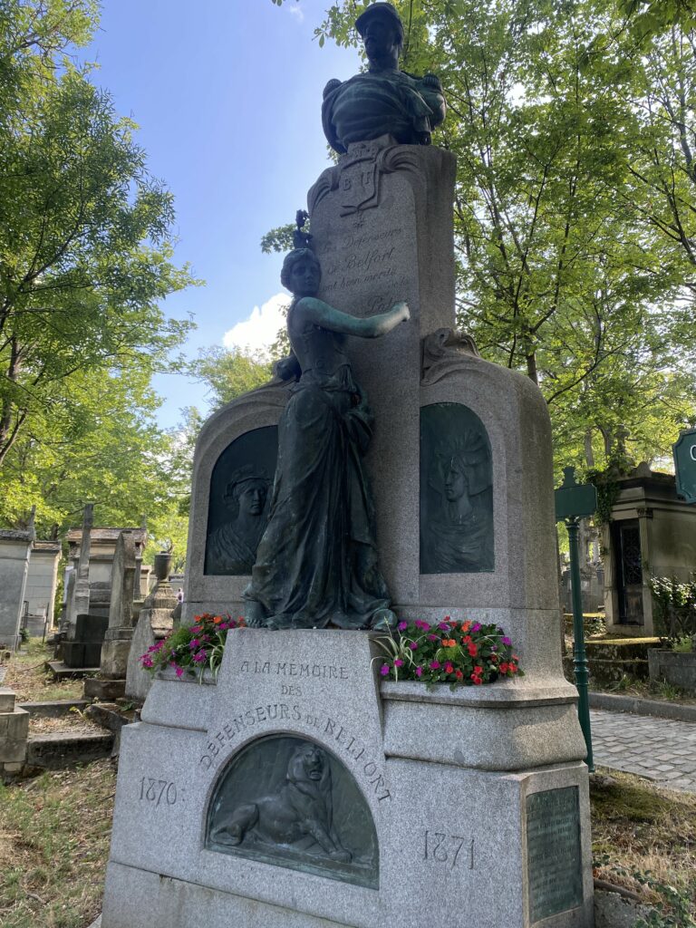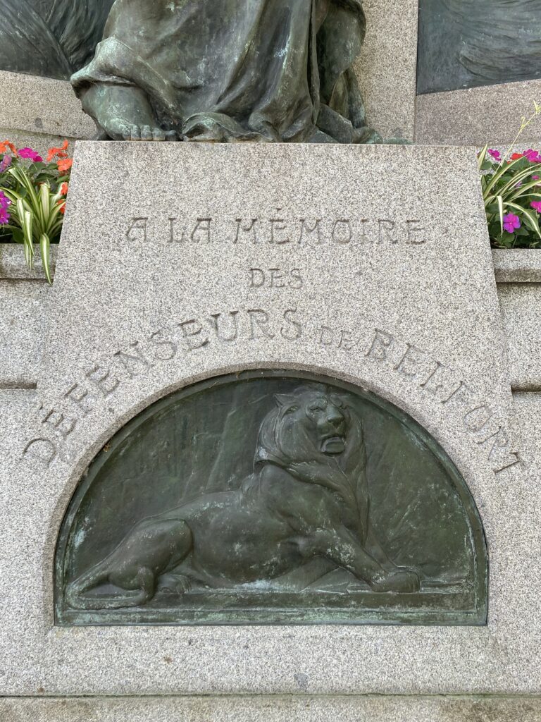 La promenade commençait bien et, déjà, me trottait dans la tête un parcours sur les représentations d’animaux dans le cimetière. C’est alors que je tombe sur le Monument à la mémoire des défenseurs de Belfort, lors de la guerre contre les Prussiens en 1870-1871. Brutus ! Eh oui, le grand sculpteur alsacien Auguste Bartholdi, sculpteur de la statue de la Liberté (excusez du peu !), s’est inspiré de Brutus pour sculpter le Lion de Belfort, monument qui commémore la résistance de la ville de Belfort lors du siège imposé par les Prussiens lors de cette guerre. Brutus y est représenté en bas-relief sur la partie basse du Monument.