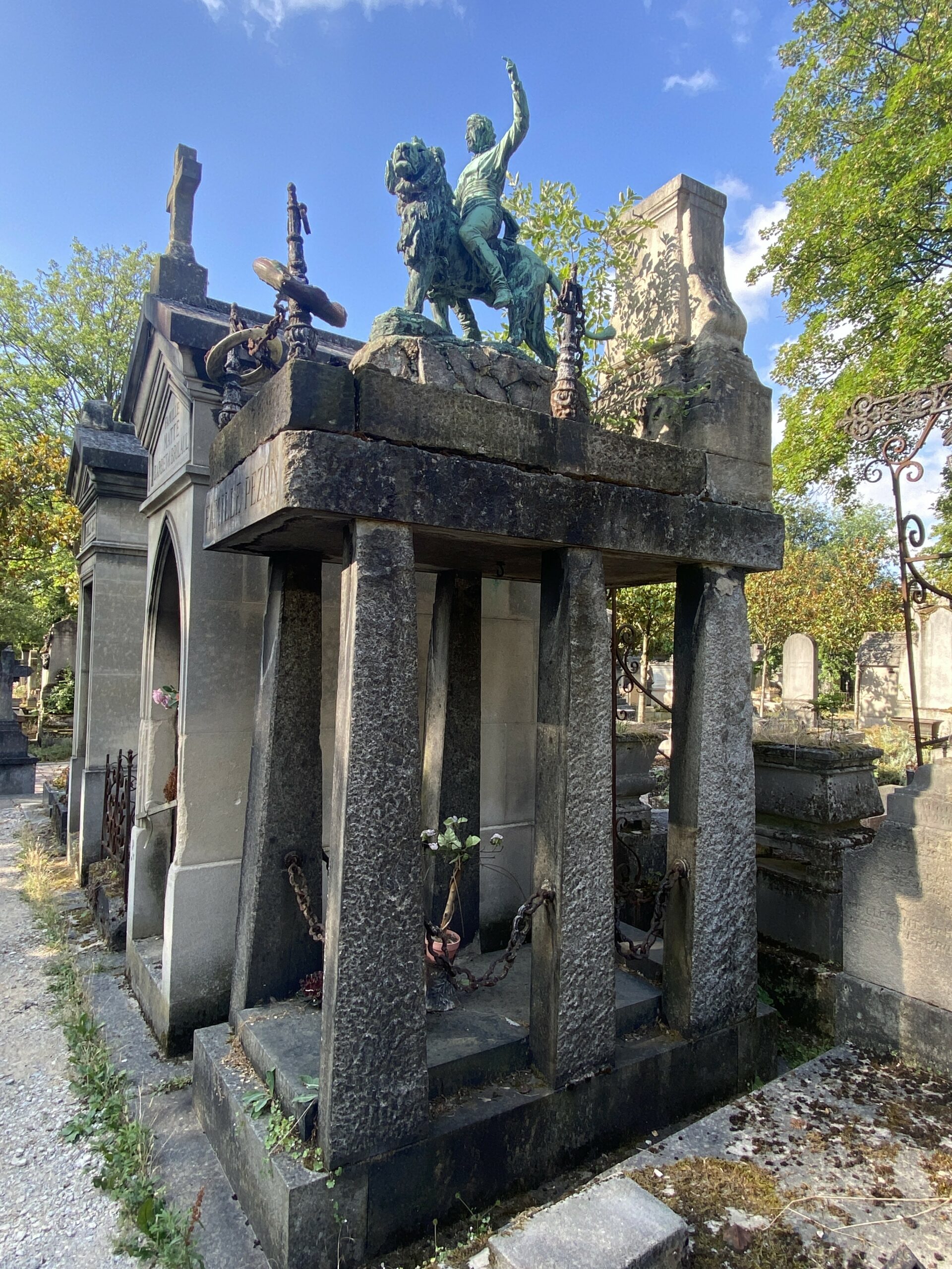 C’est lors d’une déambulation matinale que j’aperçois un homme chevauchant un lion (on dit “lionchant” du coup ?) sur le toit d’un petit temple : c’est la sépulture de Jean-Baptiste Pezon, dont le nom évoque une célèbre famille de dompteurs venue de Lozère qui fit rêver le Tout-Paris de la seconde moitié du XIXe siècle avec sa ménagerie et ses spectacles d’animaux à couper le souffle.