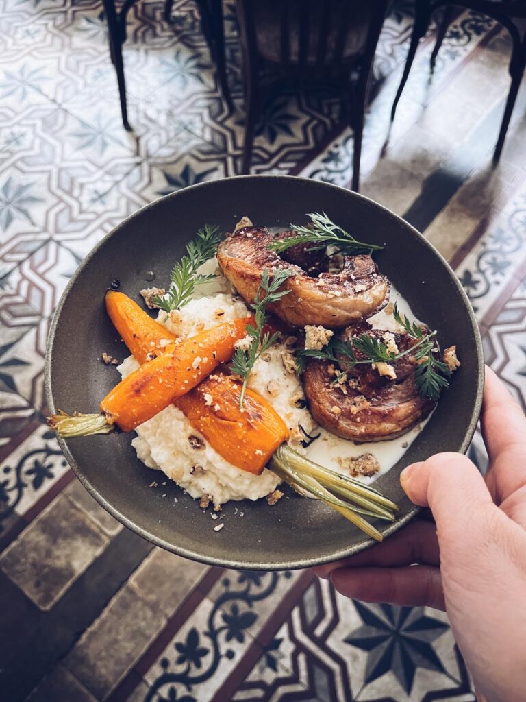 Noisette de selle d’agneau, crumble parmesan -noisettes, crème d’ail, carottes glacées, purée de céleri