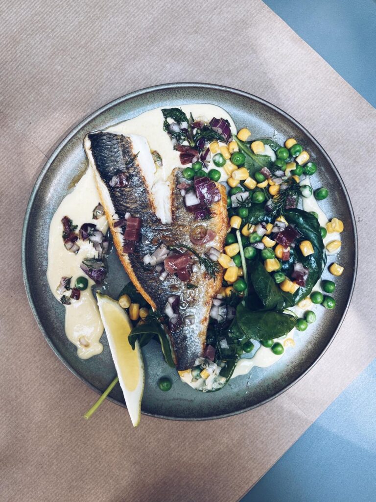 Filet de dorade Royale, crème de maïs, petits pois, vinaigrette au jambon Basque