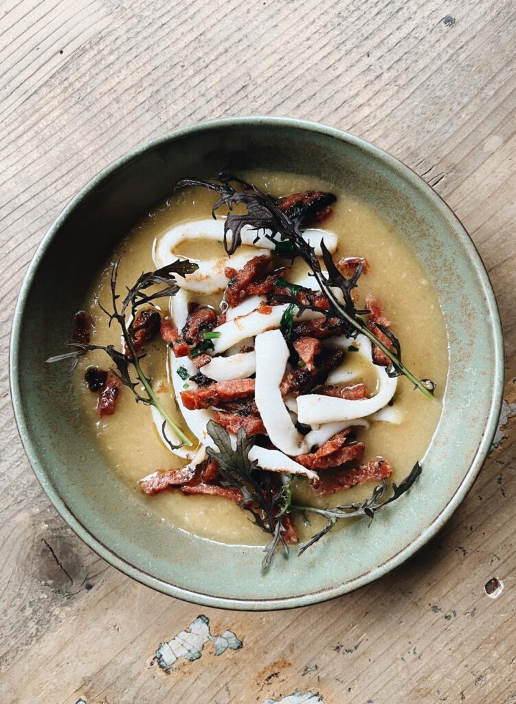 Tagliatelles d’encornets, bouillon d’oignons doux, chorizo