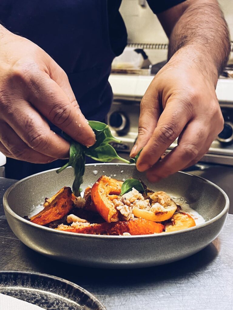 Courge rôtie, citron, bouillon parmesan, crumble parmesan, pousses d’épinards