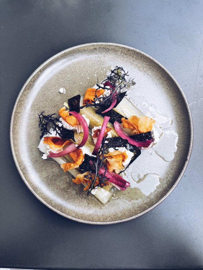 Poireaux- vinaigrette au wasabi, ricotta fumée, topinambour