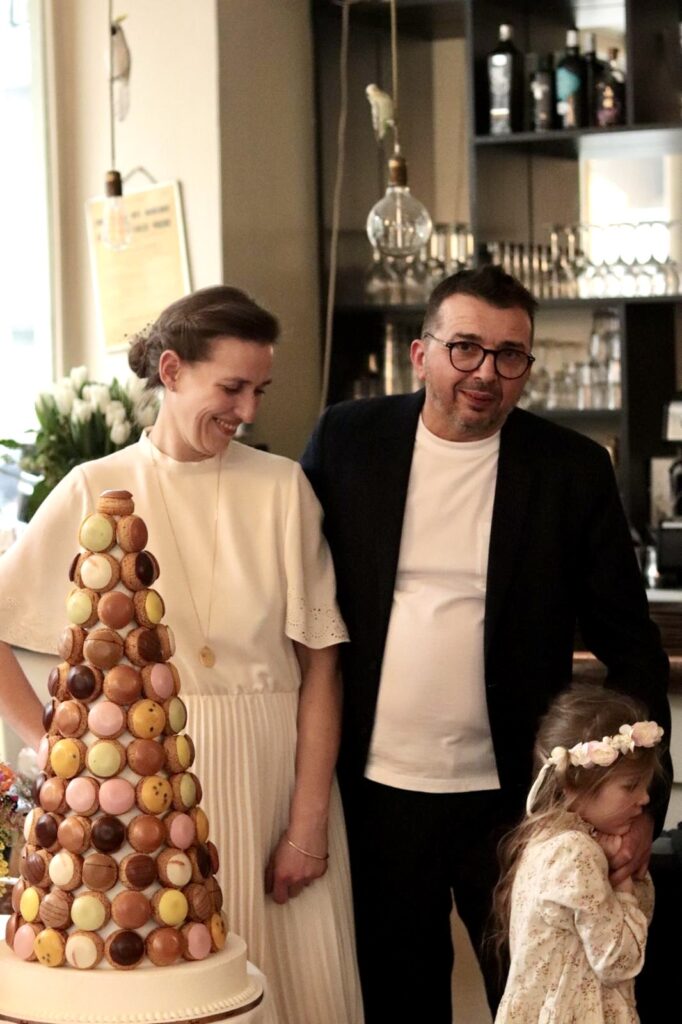 Un couple souriant, une robe blanche, une pièce montée, une demoiselle d’honneur. C’est une photo de mariage tout ce qu’il y a de plus traditionnelle, mais seulement en apparence. Car peu de jeunes mariés peuvent se targuer de recevoir leurs invités dans leur propre restaurant. On est en février 2023, Amandine et David célèbrent leur amour dans leur bistrot du 20e arrondissement qui n’a jamais aussi bien porté son nom : Chéri chérie.