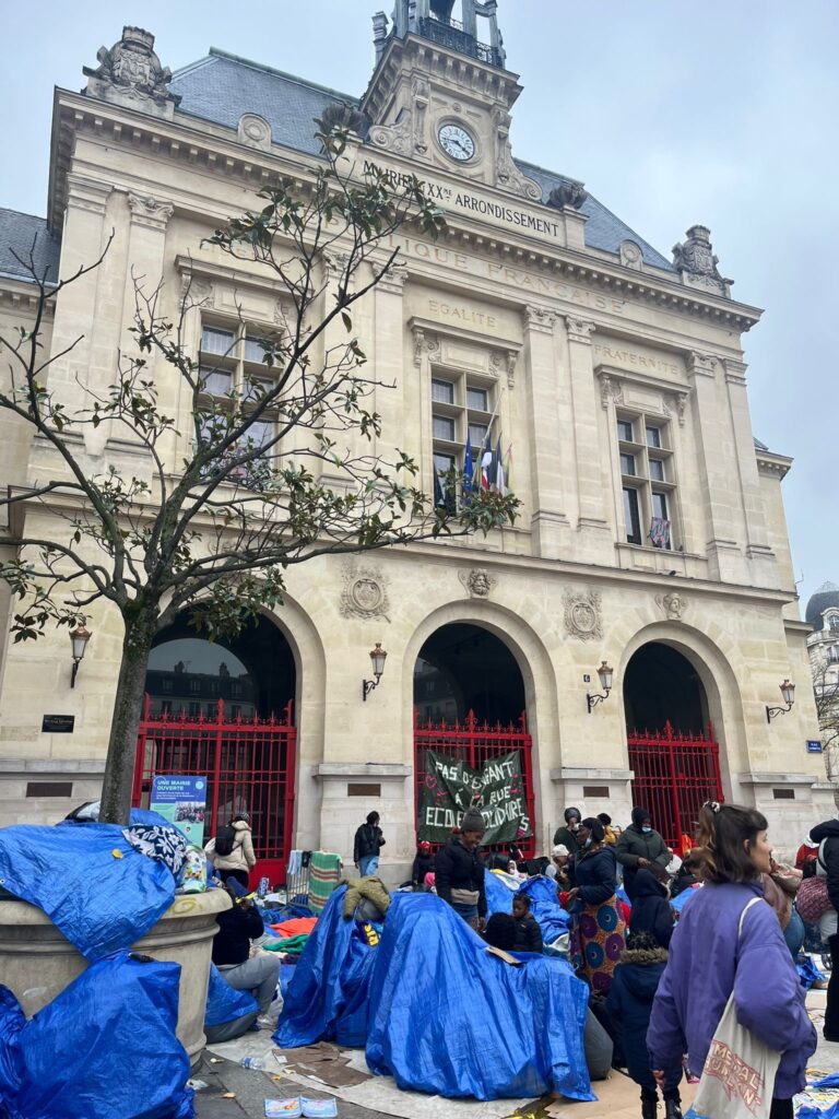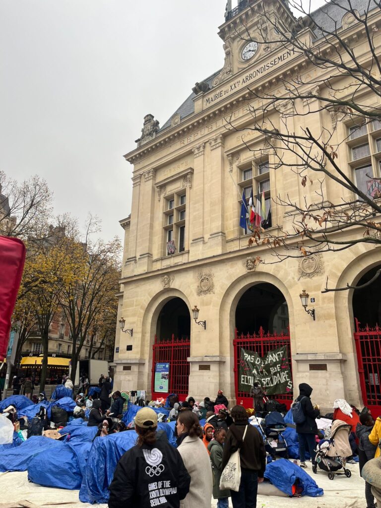 Que se passe-t-il ? Depuis mercredi soir, ce sont 200 personnes sans-abri, dont 80 à 90 enfants (incluant des nourrissons) qui dorment devant la mairie du 20e arrondissement, par manque d’hébergements d’urgence, alors que le 115 est saturé. En se rassemblant ici, ces familles – majoritairement originaires d’Afrique de l’Ouest, d’Europe de l’Est et d’Afghanistan, mais aussi françaises – espèrent obtenir une solution d’hébergement durable en Ile-de-France. Comme bien souvent dans ce genre de situation, l’état (dont c’est la compétence) et la mairie de Paris (sollicitée par les associations) se renvoient la balle. Pour éviter la pluie des derniers jours, certains groupes se sont réfugiés dans le métro, sous des kiosques, sous des porches, à proximité.