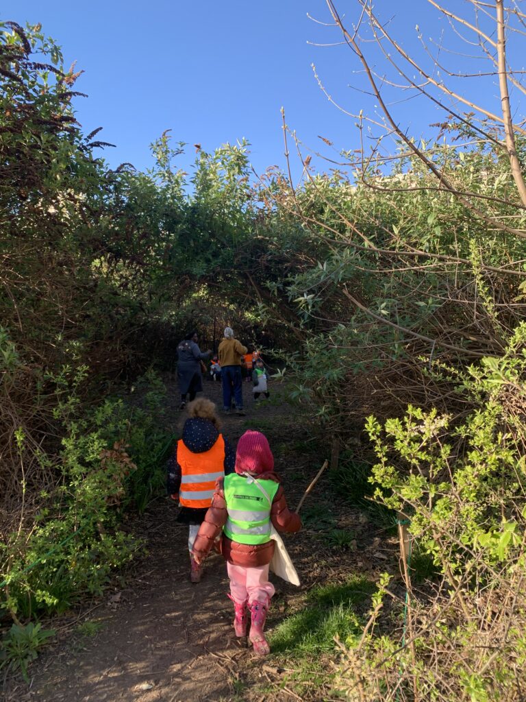 Après un exercice pour apprendre à identifier différents éléments dans la nature (une souche, une branche, une jonquille, un caillou), place au jeu libre qui permet aux enfants de découvrir par eux-même leur environnement, d’interagir, de coopérer et de faire fonctionner leur imagination. Ça creuse, ça crie, ça saute, ça court, ça balaie le sol, empile des briques, joue avec des bâtons, cherche des insectes sur un mur…