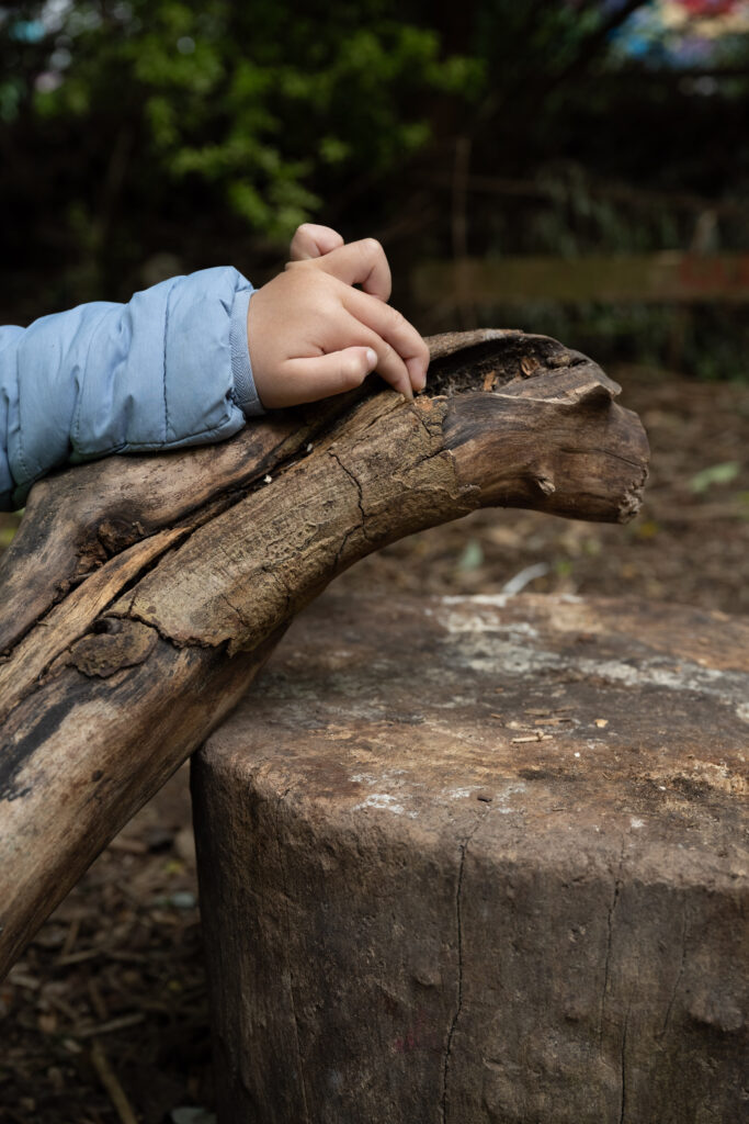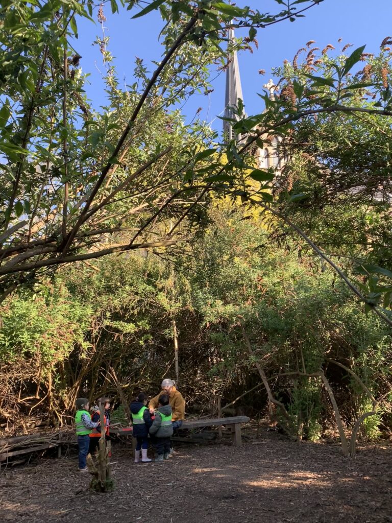 Ce projet de classe en extérieur, qui a commencé à beaucoup se développer après le Covid, a été adopté depuis deux ans par leur maîtresse, Bénédicte. Sa classe de maternelle, cette année, comprend quatre “petite section”,et douze “moyens”. C’est dehors, en pleine nature, que Bénédicte trouve ces élèves les plus épanouis. “L’an dernier, j’avais une classe difficile, mais la petite forêt a permis une cohésion de groupe plus forte. Certains se retrouvaient à coopérer pour déplacer une souche par exemple”.