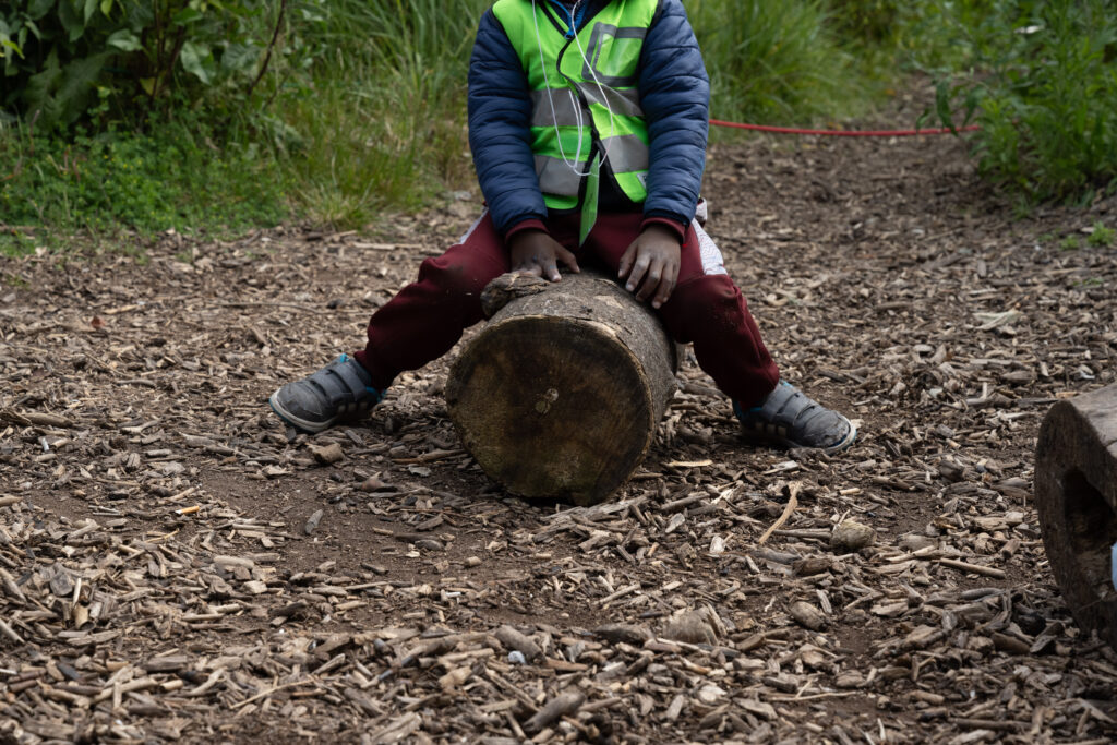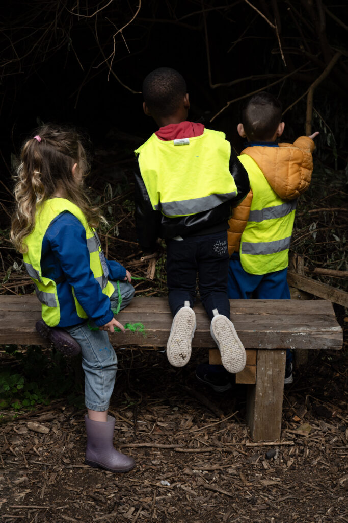 À la fin de la séance, retour sur la bâche, pour le petit rituel de clôture : dire ce qu’on a aimé faire aujourd’hui. “Faire des farces”. “Commencer une cabane”. “Sauter d’une souche à l’autre, en évitant de tomber dans la lave sinon on perd des points“. Le chemin du retour vers l’école est là encore un prétexte pour observer. Un arbre en fleurs par-ci, les chiffres de la rue, par là. Preuve que l’apprentissage est possible partout, constamment. À qui sait être là pour l’initier.
