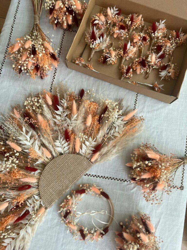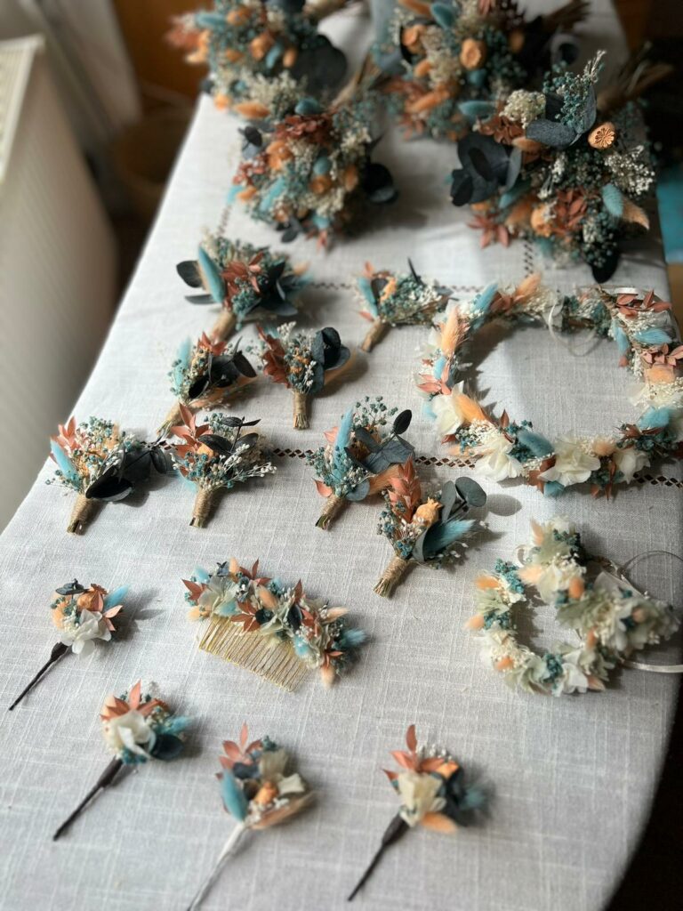 Son offre se diversifie : bouquets, couronnes, peignes, bracelets, arche, boutonnières… toujours en fleurs séchées ou stabilisées (préservées dans leur état de fraîcheur pendant de très longues années). L’une des singularités de Fanny, c’est de proposer la vente à la tige (à partir de 0,10 €) dans son atelier qui permet de s’adapter à tous les budgets et de personnaliser les créations. « Avant d’être dans ce métier, j’étais frustrée de devoir acheter mes fleurs séchées en grosse botte pour remplir deux petits vases. C’est souvent la seule offre disponible sur le marché. Ici, je veux que mes clients puissent personnaliser leur composition et prendre la quantité qu’ils veulent à leur budget. »