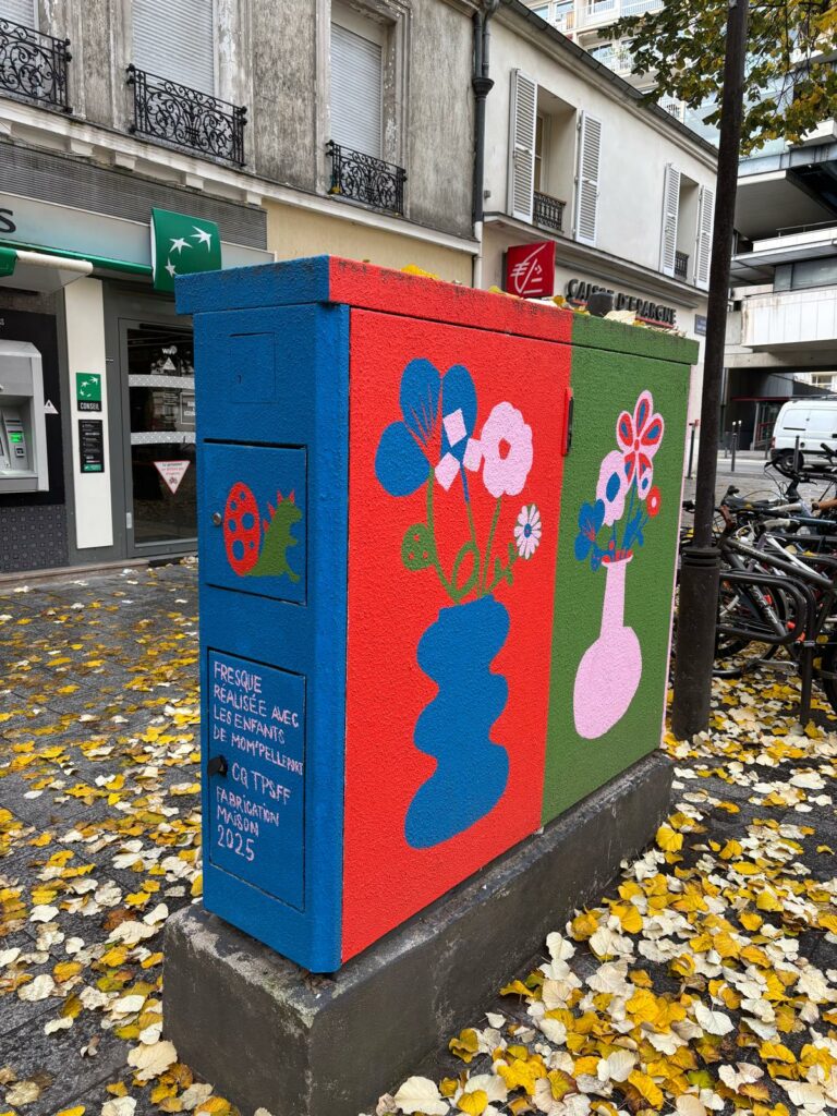 On se réjouit qu’en de nombreux endroits du 20e arrondissement, elles servent de support à des artistes. Ajoutant un peu de beauté à leur utilité publique.  C’est le cas à Saint-Fargeau, sur la placette accueillant la bouche de métro. Les enfants accueillis par l’association Mom’Pelleport (qui propose un mode de garde artistique) ont réalisé, cette année, plusieurs compositions florales très colorées, avec le soutien du Conseil de quartier TPSFF (Télégraphe – Pelleport – Saint-Fargeau – Fougères). Ne manquez pas le petit dino très mignon sur l’une des tranches, sûrement ajouté à la demande d’un enfant.