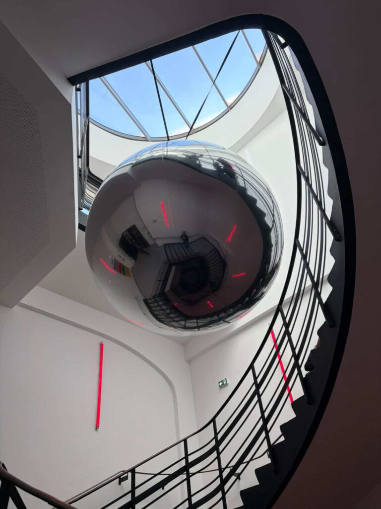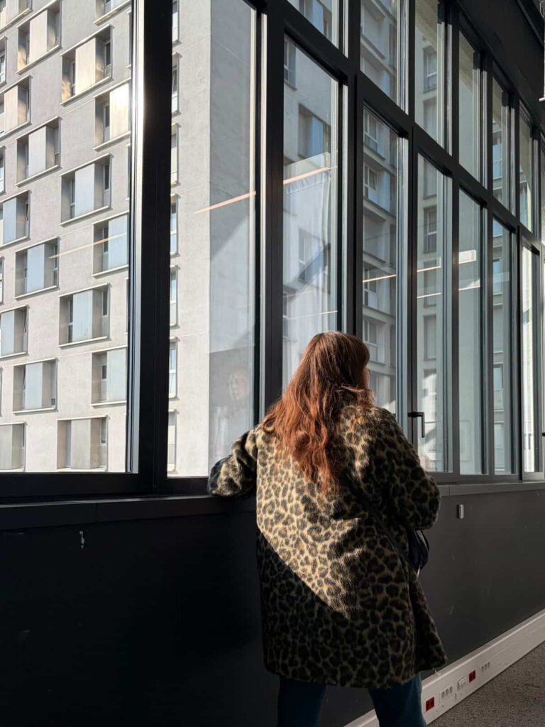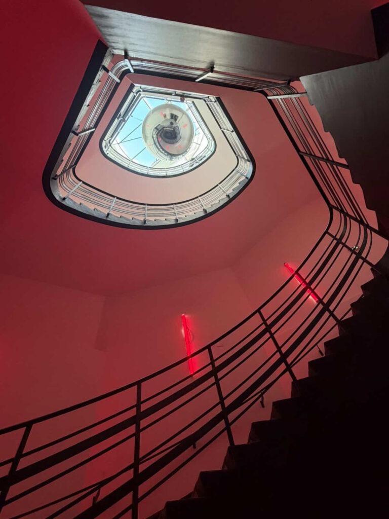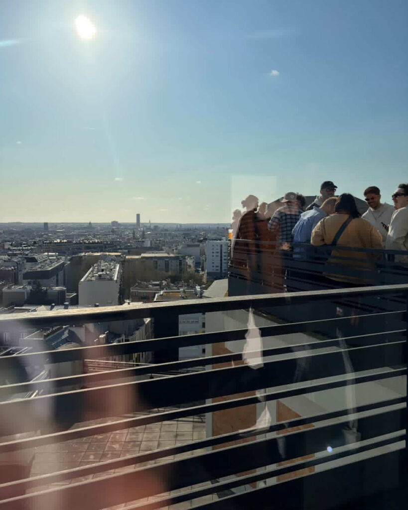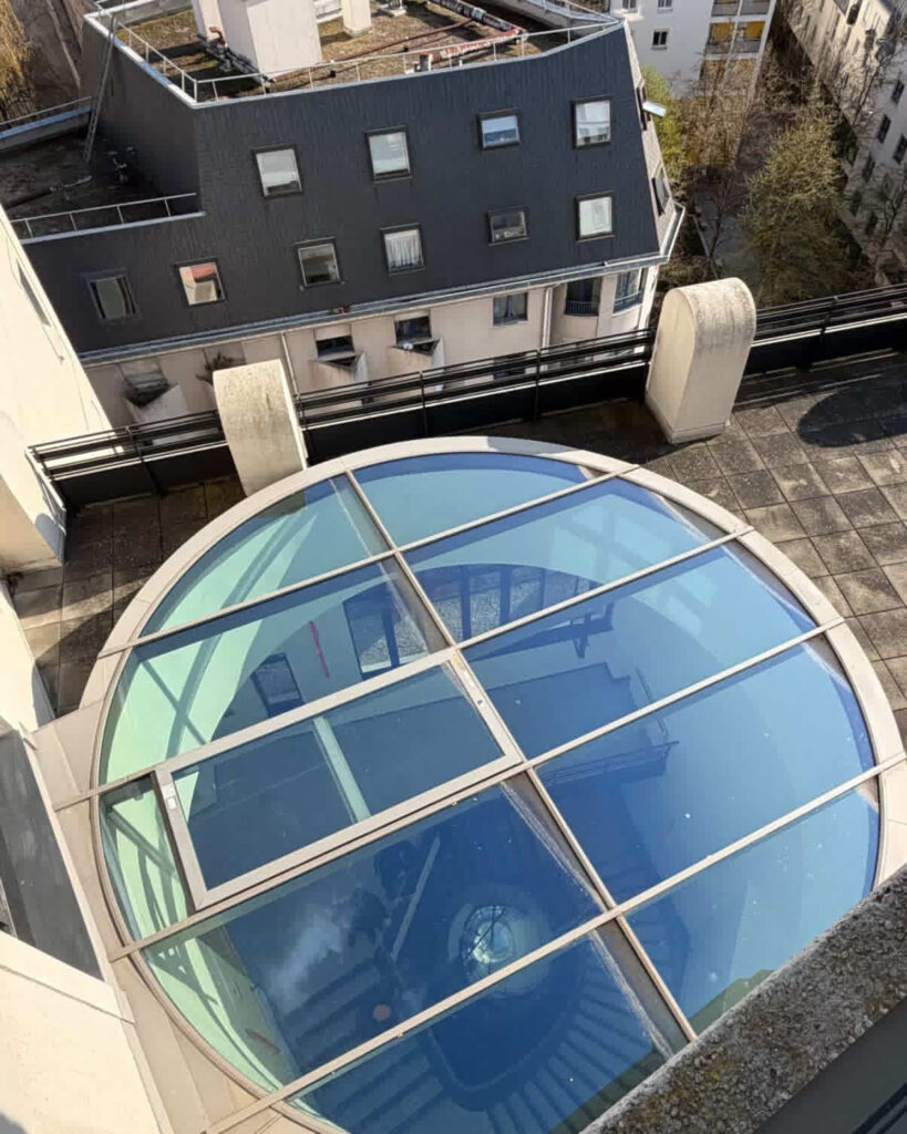 La façade arrière (rue Elisa Borey) est plus austère, plus classique, avec des arcs-boutants en béton qui stabilisent l’édifice. Cette dualité des façades renseigne sur l’utilisation du bâtiment. La partie Sorbier abritait les bureaux, tandis que la façade Borey dissimulait la partie technique, les machines… Le véritable trésor de l’édifice, c’est l’escalier principal en son centre. Il vous faudra l’emprunter pour grimper dans les étages et rejoindre la terrasse panoramique offrant un tête-à-tête avec Paris.