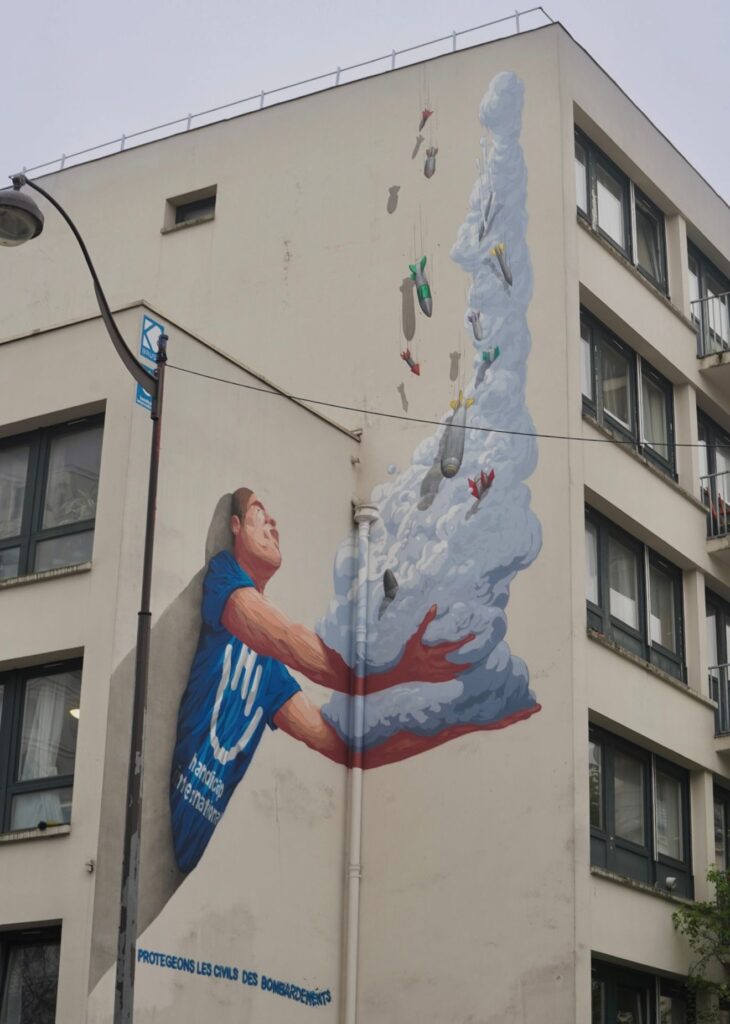 Dessinée sur un bâtiment municipal abritant notamment un centre de santé et une permanence sociale d’accueil pour personnes vulnérables, cette fresque met en scène un travailleur humanitaire : il retient des bombes tombant du ciel – empêchant qu’elles n’explosent sur les passants et les visiteurs entrant dans le bâtiment. Une œuvre forte qui vise à sensibiliser au fait que les civils constituent aujourd’hui 90 % des victimes dans les conflits armés. Selon le rapport 2024 de l’Observatoire des armes explosives, des civils ont été touchés cette année là dans 74 pays à cause des bombardements et pilonnages.