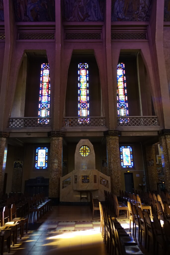 Ainsi l’église, qu’on croyait en béton, est essentiellement construite en briques enduites de ciment. Et la blancheur immaculée des murs extérieurs n’est pas du tout d’origine : ces murs étaient d’un ton pierre avec des faux joints et des effets de texture tracés à la main. De même, si l’unité esthétique semble étudiée jusqu’au moindre détail, des chaises aux poignées de porte des confessionnaux, les matériaux, eux, ne sont pas toujours homogènes, ce qui rendra délicates les reprises.