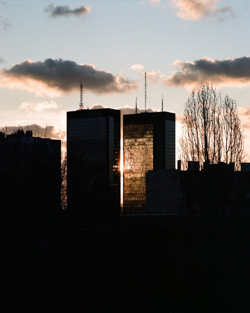 « Il n’y a pas de meilleure heure. C’est sûr que les couchers de soleil sont incroyables. Quand on les voit depuis Paris, le soleil se couche en reflet dans les tours, quand c’est orageux, le ciel peut être hyper sombre derrière, c’est cette dualité qui est pour moi la plus belle. Ça marche aussi dans l’autre sens, depuis la banlieue, avec le lever du soleil, mais je suis moins matinal (mais je me suis déjà levé tôt pour elles).