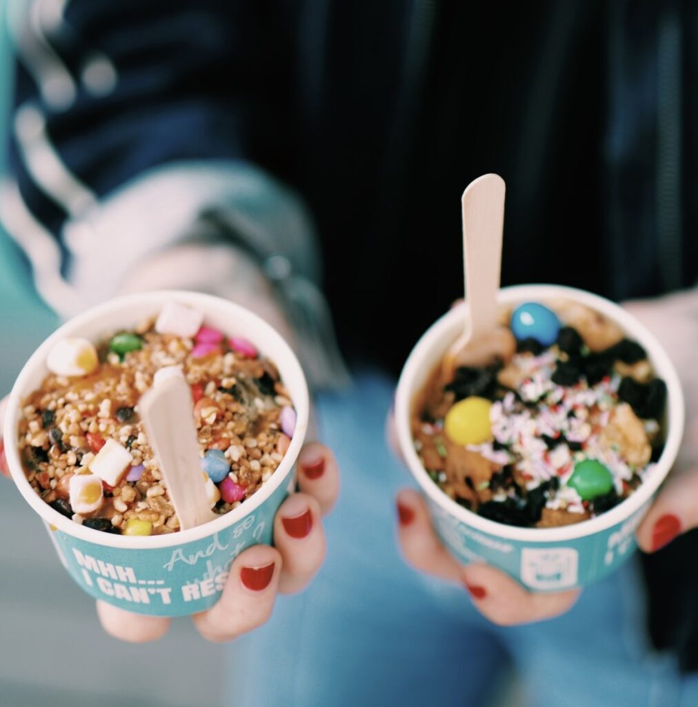 Bienvenue chez We Dough, première enseigne à avoir lancé ce concept en France, en 2019. Tout a débuté par une histoire d’amitié. Celle d’Anastasia et Emma, 29 ans aujourd’hui. En 2018, quand elles se rencontrent, elles sont étudiantes à Montréal. C’est lors d’un week-end à New York, qu’elles découvrent la cookie dough, la fameuse pâte à cookie crue. Pour Anastasia, grosse fan de cookies depuis l’enfance, c’est une révélation. De retour à Paris, tout en finissant leurs études, elles décident de se lancer et d’ouvrir leur premier pop-up store.